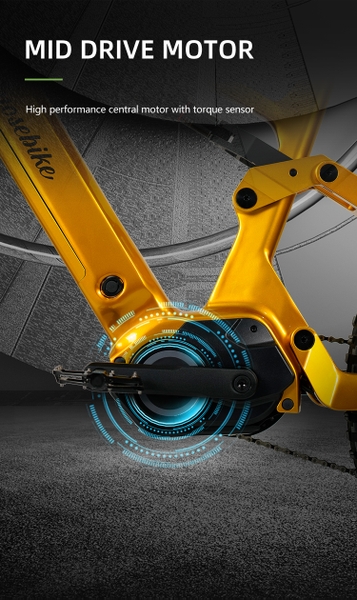 Chiếc xe được trang bị động cơ trung tâm 48V 500W, cung cấp sức mạnh và momen xoắn lớn, cho phép xe vượt qua các dốc cao và địa hình phức tạp một cách dễ dàng. Đặt động cơ ở vị trí trung tâm cũng giúp cân bằng tốt hơn và ổn định xe khi di chuyển, mang lại cảm giác lái chắc chắn và an toàn.