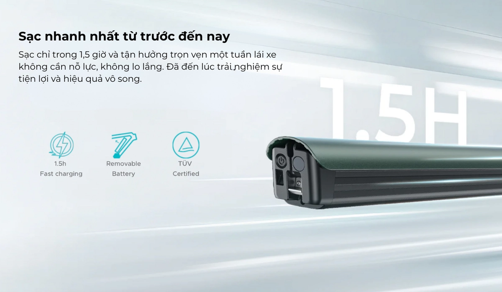 Sạc Siêu Tốc 1.5 Giờ & Pin Tháo Rời Tiện Lợi: