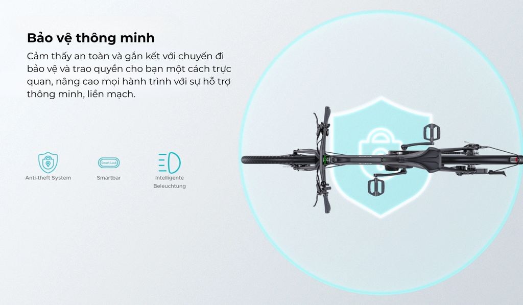 - Thanh thông minh dẫn đường qua app - Đèn hậu năng lượng mặt trời - Khóa tự động sau 5 phút không hoạt động |