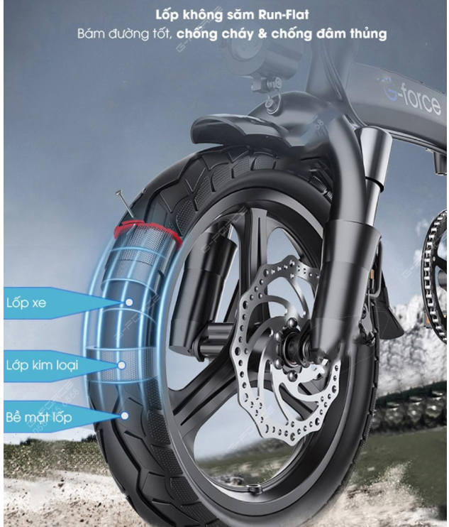 Xe đạp gấp G-Force C14 Pro được trang bị cặp bánh xe với loại lốp không săm Run-Flat giúp giảm lo lắng khi di chuyển trên đường, đặc biệt khi đối mặt với vật nhọn hoặc va chạm mạnh. Dưới bề mặt lốp có thêm một lớp kim loại để hạn chế tối đa tình trạng thủng lốp,bề mặt lốp có các đường rãnh để tăng độ ma sát với mặt đường. Điều này giúp cải thiện khả năng bám đường và chống trơn trượt.