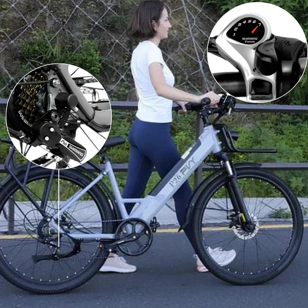 Xe đạp trợ lực PVY P26 sử dụng bộ truyền động Shimano 7 cấp độ, giúp người dùng dễ dàng thay đổi tốc độ theo nhu cầu. Từ số 0 (dẫn động trực tiếp từ bàn đạp) đến số 7 (tốc độ di chuyển cao), PVY P26 đáp ứng mọi yêu cầu về vận tốc của người sử dụng, từ đi trong thành phố đến leo dốc cao.