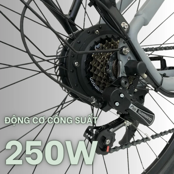 Xe đạp trợ lực điện PVY P26 được trang bị động cơ công suất 250W với mô-men xoắn 65Nm, giúp xe dễ dàng vượt qua các địa hình dốc và di chuyển linh hoạt trên mọi loại địa hình. Động cơ này không chỉ bền bỉ mà còn hoạt động êm ái, tiết kiệm năng lượng, phù hợp cho các chuyến đi dài hoặc sử dụng hàng ngày.