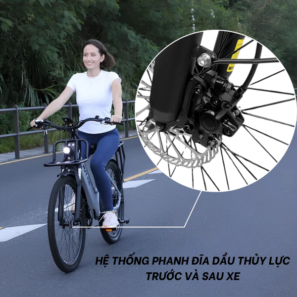 Xe đạp PVY P26 sử dụng hệ thống phanh đĩa dầu thủy lực cho cả bánh trước và sau. Hệ thống này giúp tăng hiệu quả phanh, đảm bảo an toàn tối đa cho người dùng, đặc biệt khi di chuyển trên những địa hình dốc hoặc trơn trượt. Phanh thủy lực còn giúp người lái dễ dàng kiểm soát tốc độ xe hơn so với phanh cơ truyền thống.