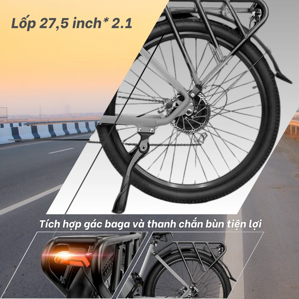 Lốp xe béo 27.5*2.1 inch tăng diện tích tiếp xúc với mặt đường, cải thiện độ bám và ổn định khi di chuyển trên nhiều loại địa hình khác nhau. Vành xe làm từ kim loại đúc chắc chắn, giúp chắn bùn và nước tốt hơn, đảm bảo an toàn và sạch sẽ cho người lái trong mọi điều kiện thời tiết.