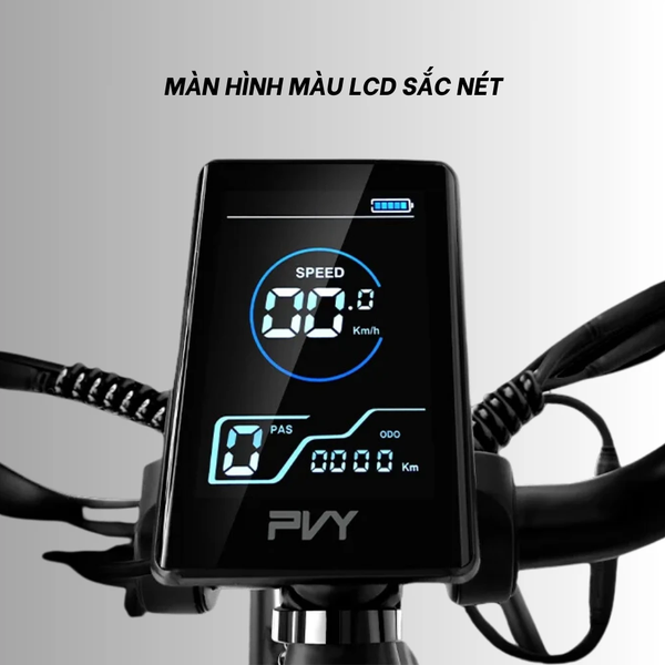 Hệ thống tay lái của PVY P26 được thiết kế để mang lại sự thoải mái và dễ dàng sử dụng. Tay lái tích hợp màn hình LCD màu sắc nét, chống nước IPX5, giúp hiển thị rõ ràng các thông số cần thiết như tốc độ, quãng đường, lượng pin,... Hệ thống này hỗ trợ người dùng kiểm soát hành trình một cách hiệu quả.