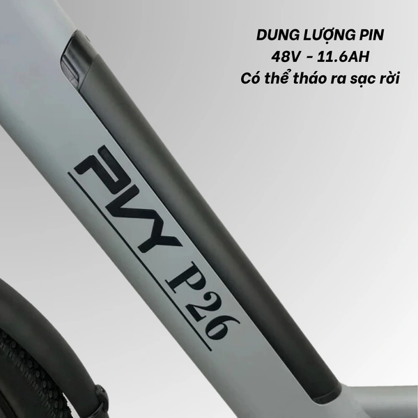 Xe đạp điện PVY P26 sử dụng pin lithium 36V 11.6Ah, cho phép xe di chuyển quãng đường lên đến 100km ở chế độ đạp điện và 80km ở chế độ thuần điện. Pin này có khả năng tháo rời dễ dàng, giúp việc sạc lại thuận tiện và tiết kiệm thời gian hơn.