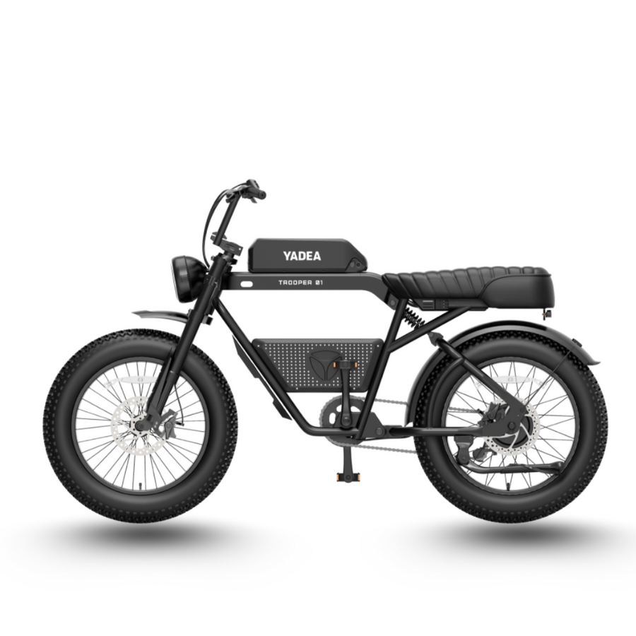 Yadea Trooper 01 là chiếc xe đạp điện hiếm hoi sở hữu thiết kế đậm chất cổ điển pha lẫn hơi hướng mô-tô Mỹ những năm 70. Phần khung được chế tạo từ hợp kim nhôm nguyên khối, phủ lớp sơn tĩnh điện nhám cực bền và bắt mắt, đi kèm là yên đôi dài, tay lái rộng kiểu cruiser – tạo nên dáng ngồi cực ngầu nhưng vẫn thoải mái cho người lái. Bất kể bạn chạy trong phố hay dạo chơi cuối tuần, Trooper 01 luôn khiến người khác phải ngoái nhìn.